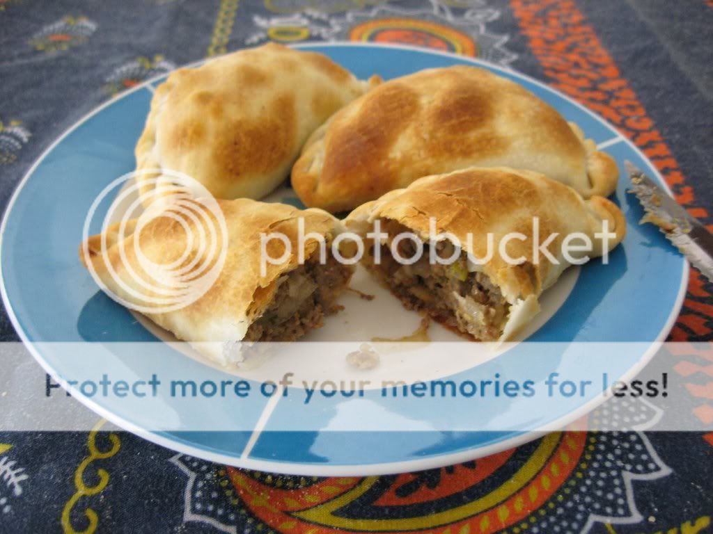 Se marcan redondeles con un plato de té, se cortan con un cuchillo y se les pone en el centro una cucharada colmada de relleno. Encima se ponen huevo, aceituna y pasas. Se pintan los bordes con agua, se cierran las empanadas y se aprietan los bordes con un tenedor enharinado.